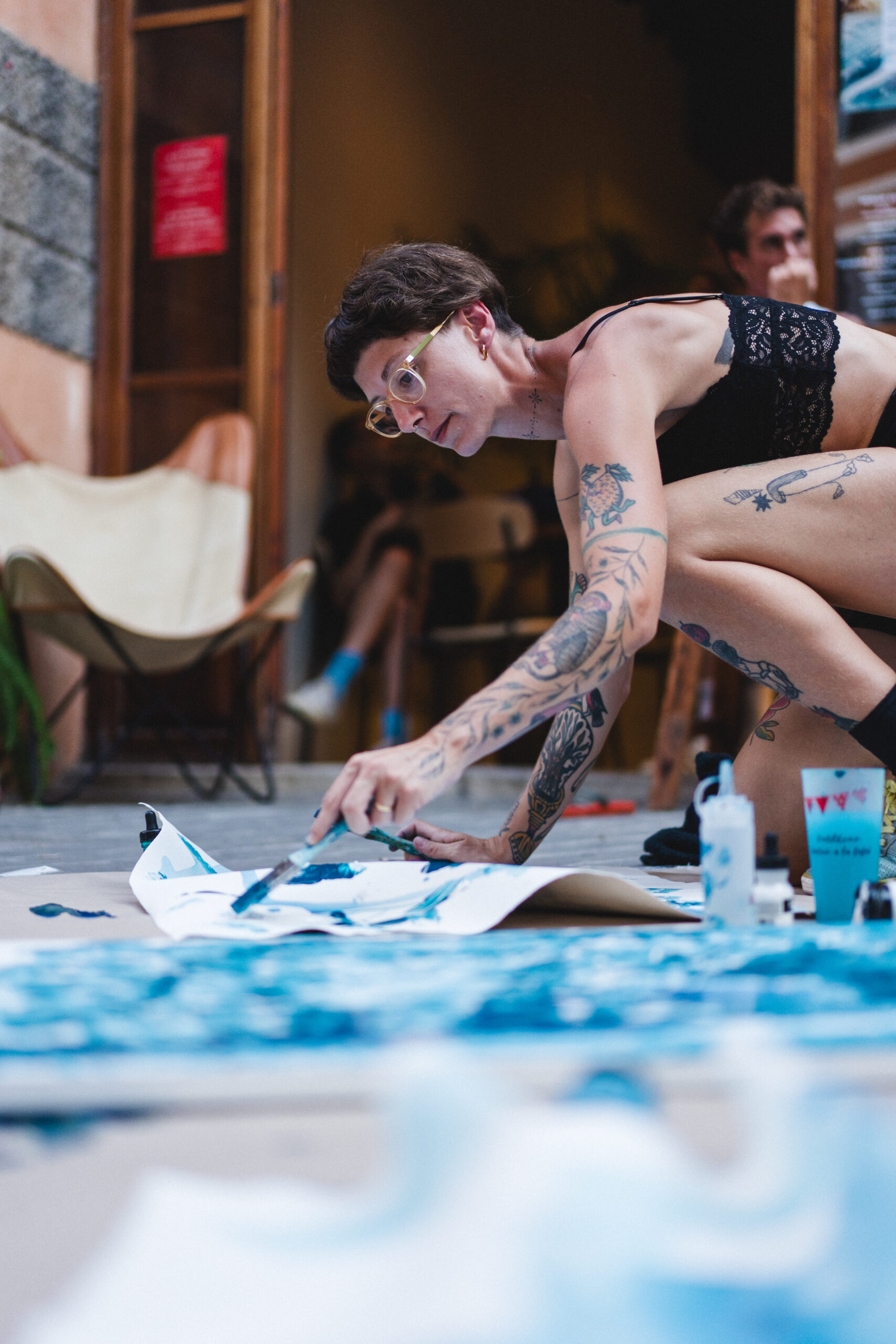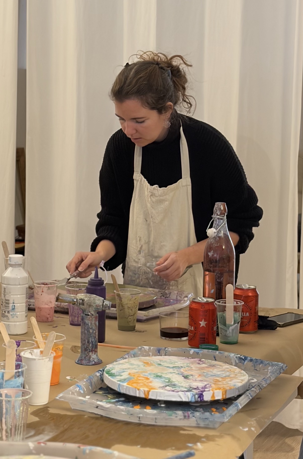 Materials professionals: Llens de qualitat, pinzells i una paleta de colors vibrants de pintura BONA (dada important quan vas a un espai així). No tota la pintura acrílica serveix igual, i volem que la teva obra duri com a obra d’art.